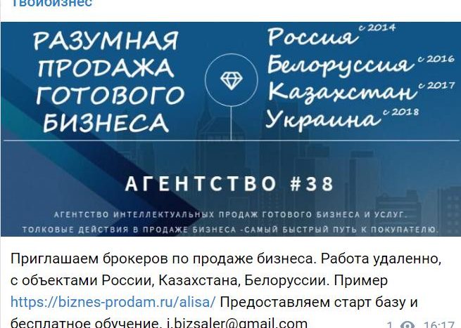 Приглашаем брокеров по продаже бизнеса. Работа удаленно, с объектами России, Казахстана, Белоруссии. Пример https://biznes-prodam.ru/alisa/ Предоставляем старт базу и бесплатное обучение.