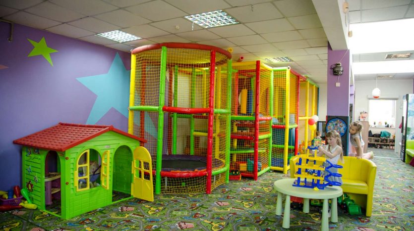 Наполнение Игрового центра: двухуровневый лабиринт, батут, аэрохоккей, скалодром, мебель, аэрохоккей, икс-бокс, кассовый аппарат, рецепш, гримерка, оборудованная гостевая зона для приема пищи (столы, стулья, микроволновка, чайник, холодильник, кулер)