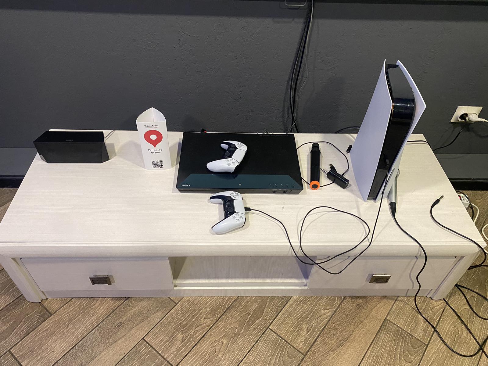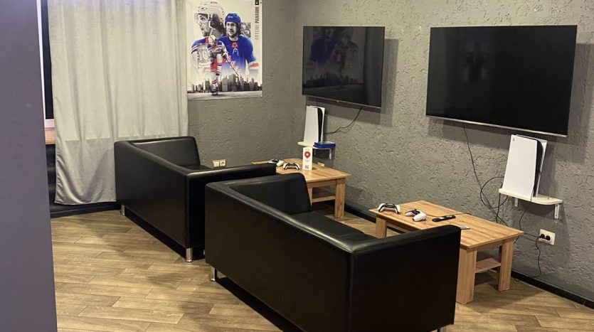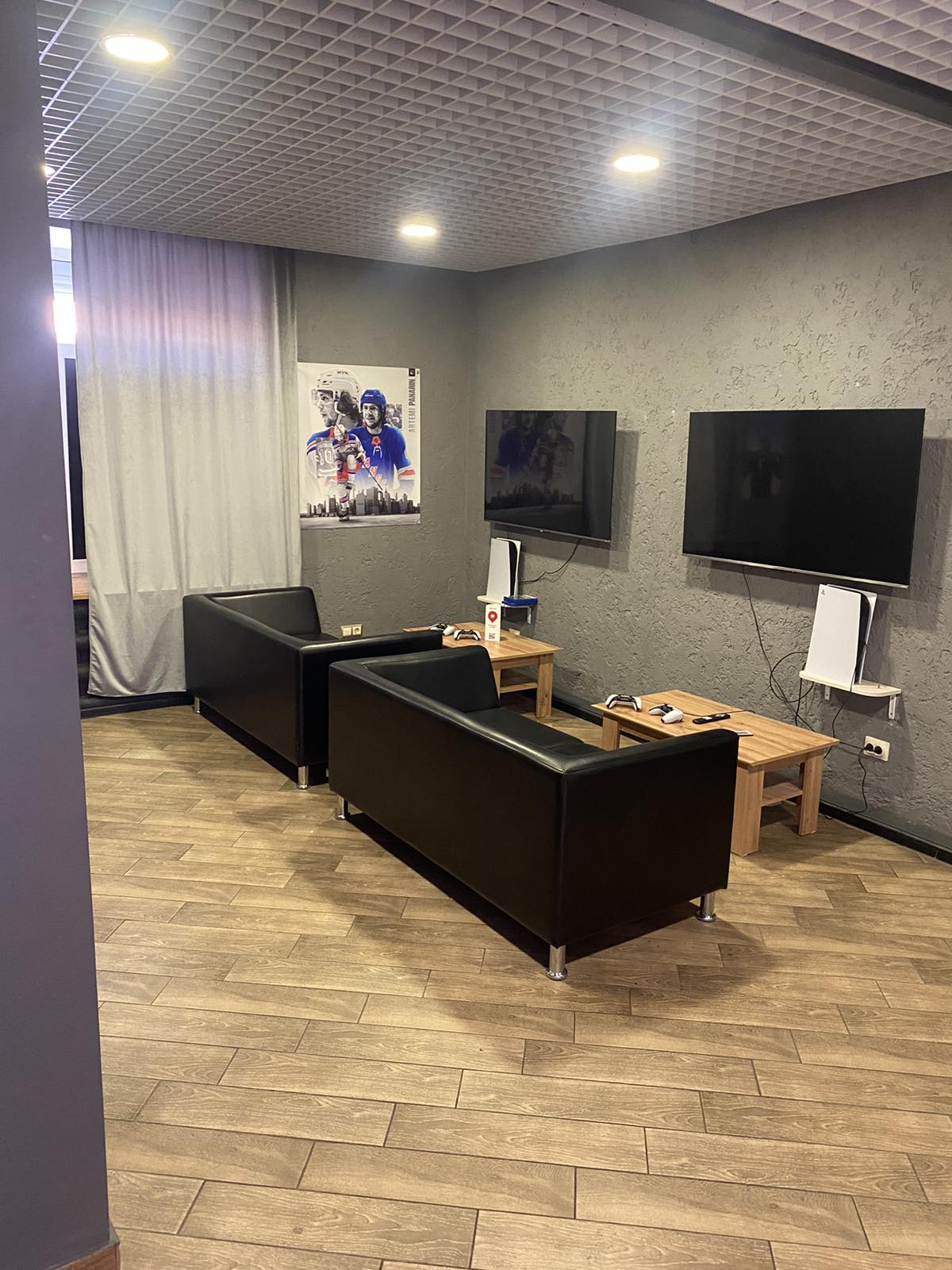 Первый зал: 2 телевизора; 2 приставки PS5; столики, комфортабельные диваны,