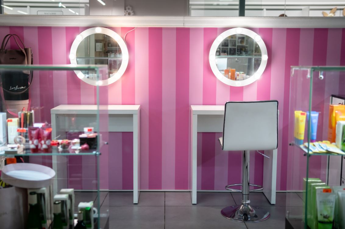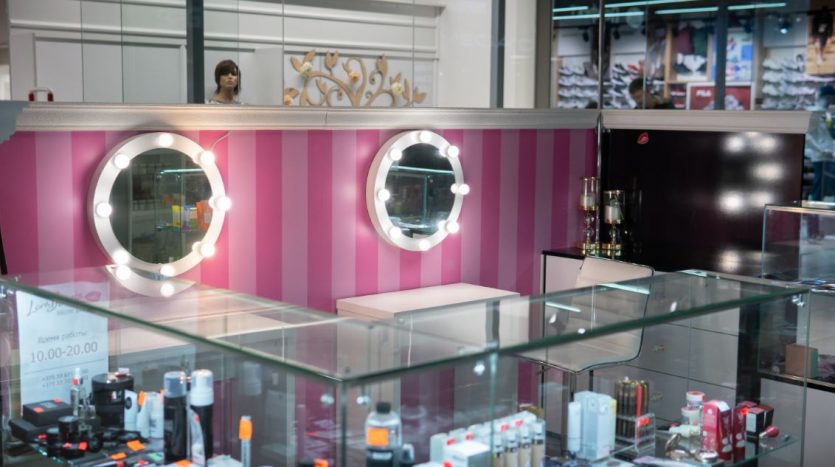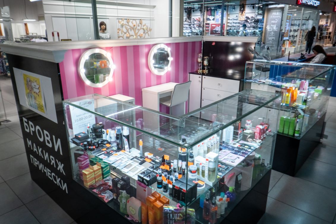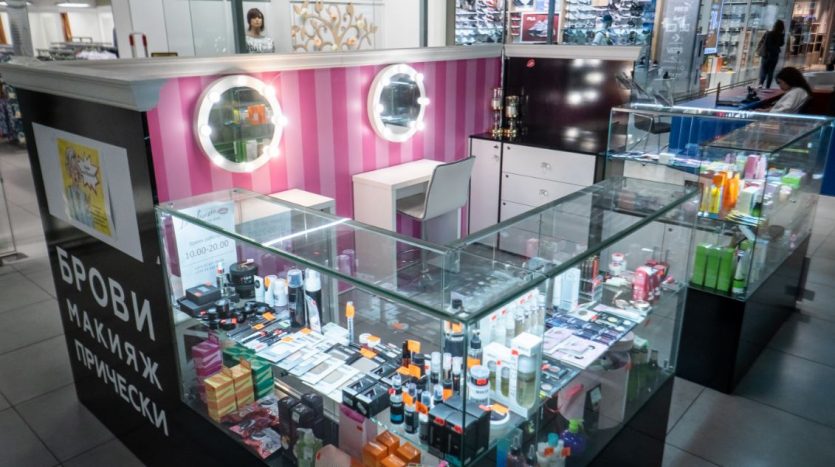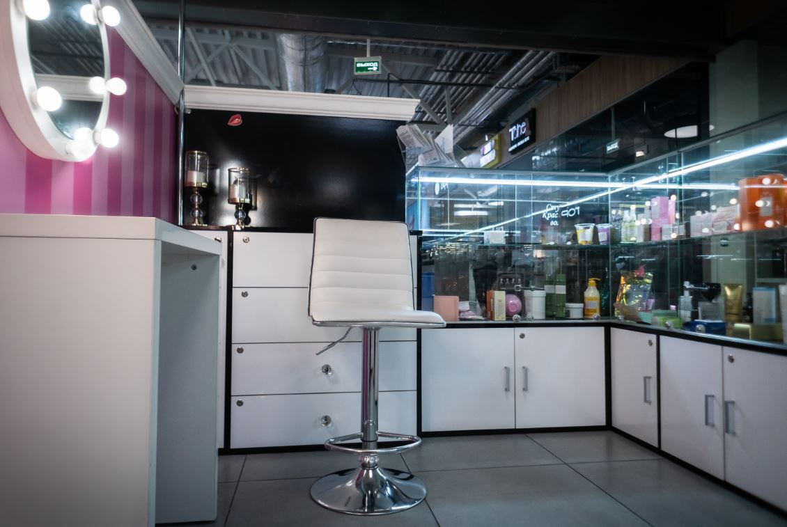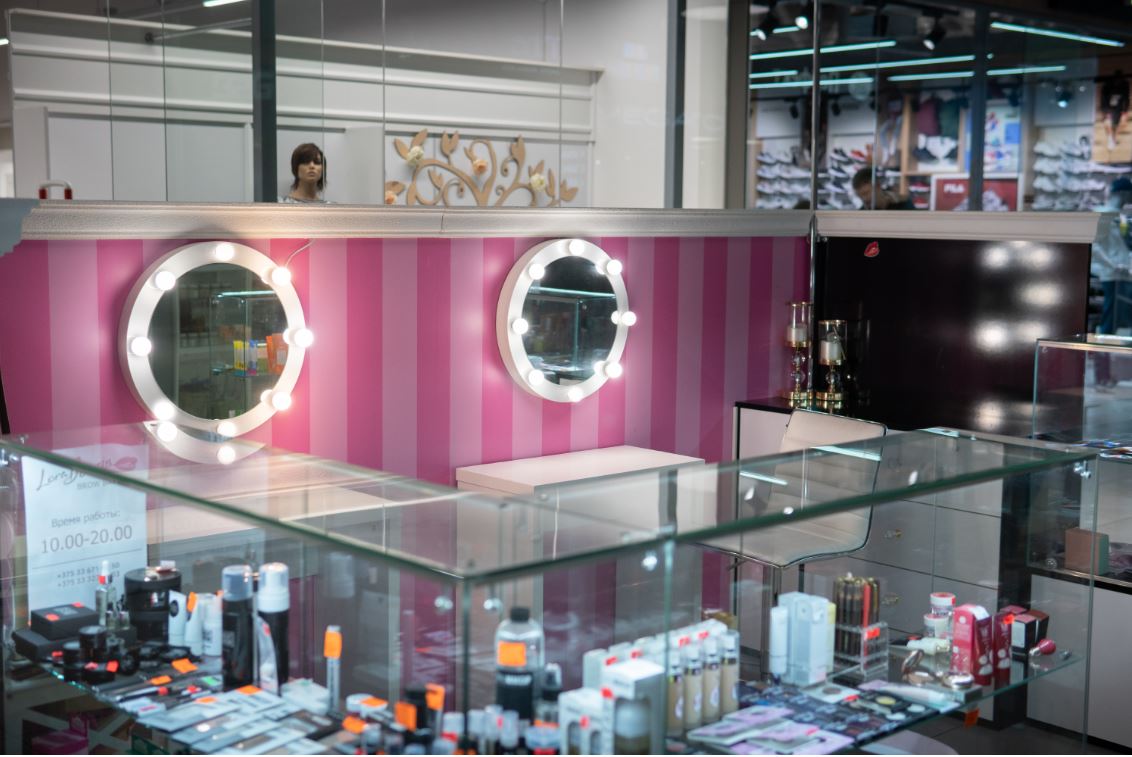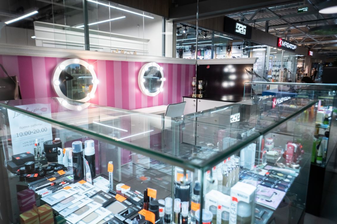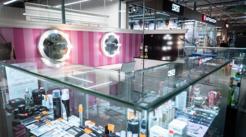 Оборудование: шкафы с витринами для продукции , стол визажиста, маникюрный стол.