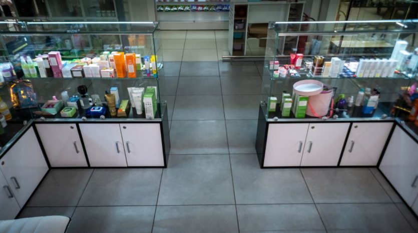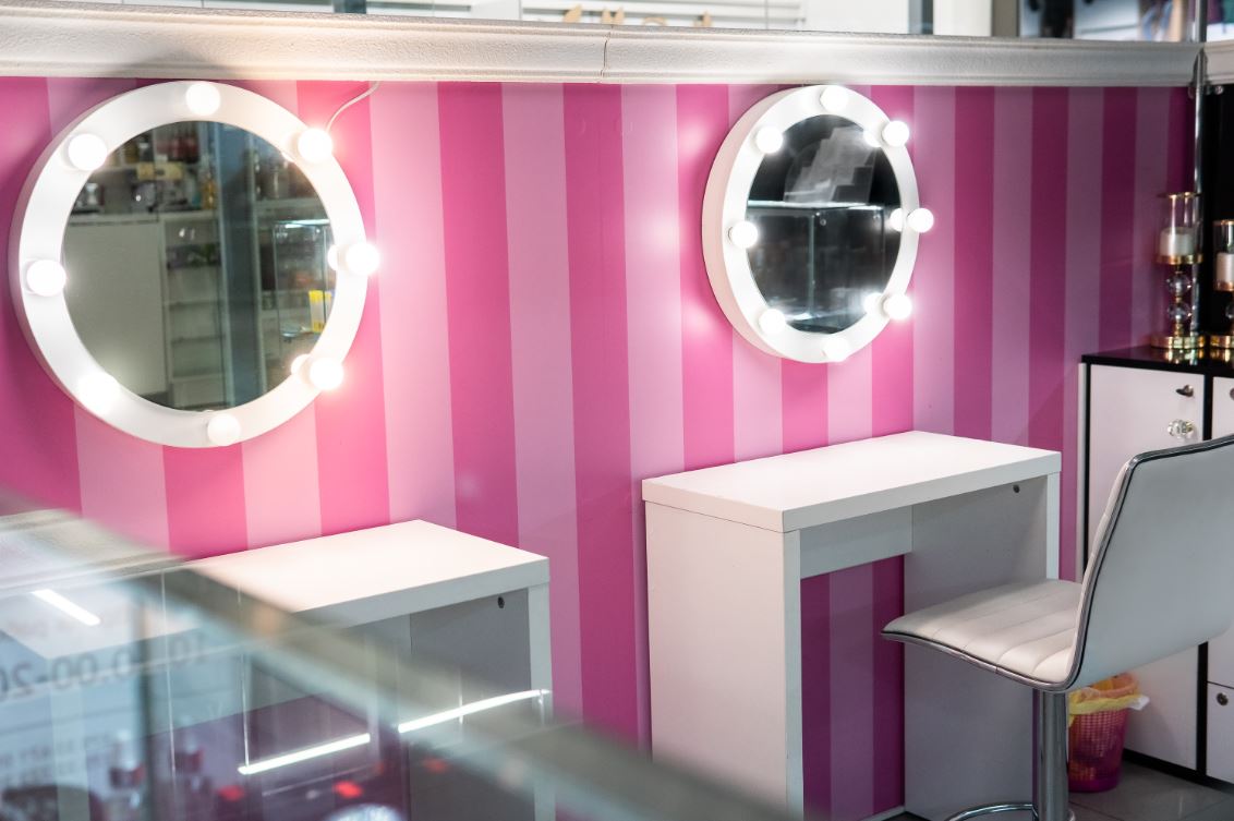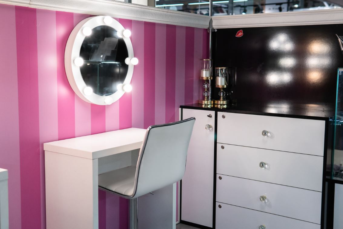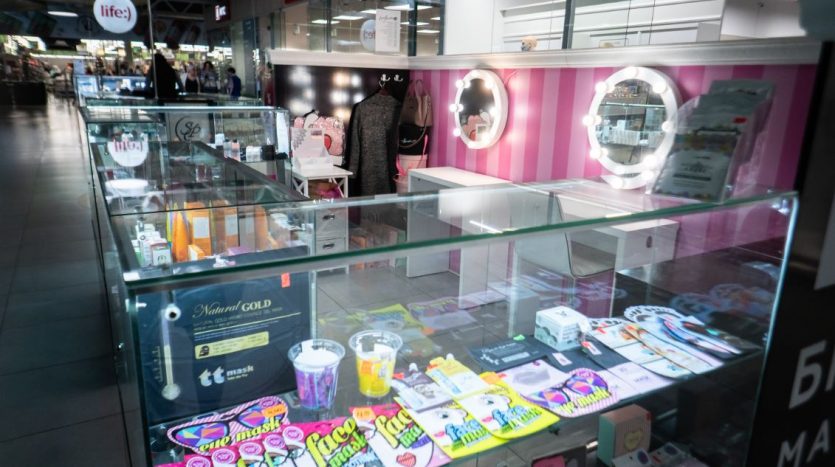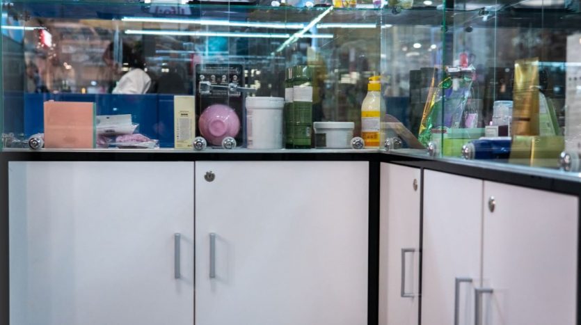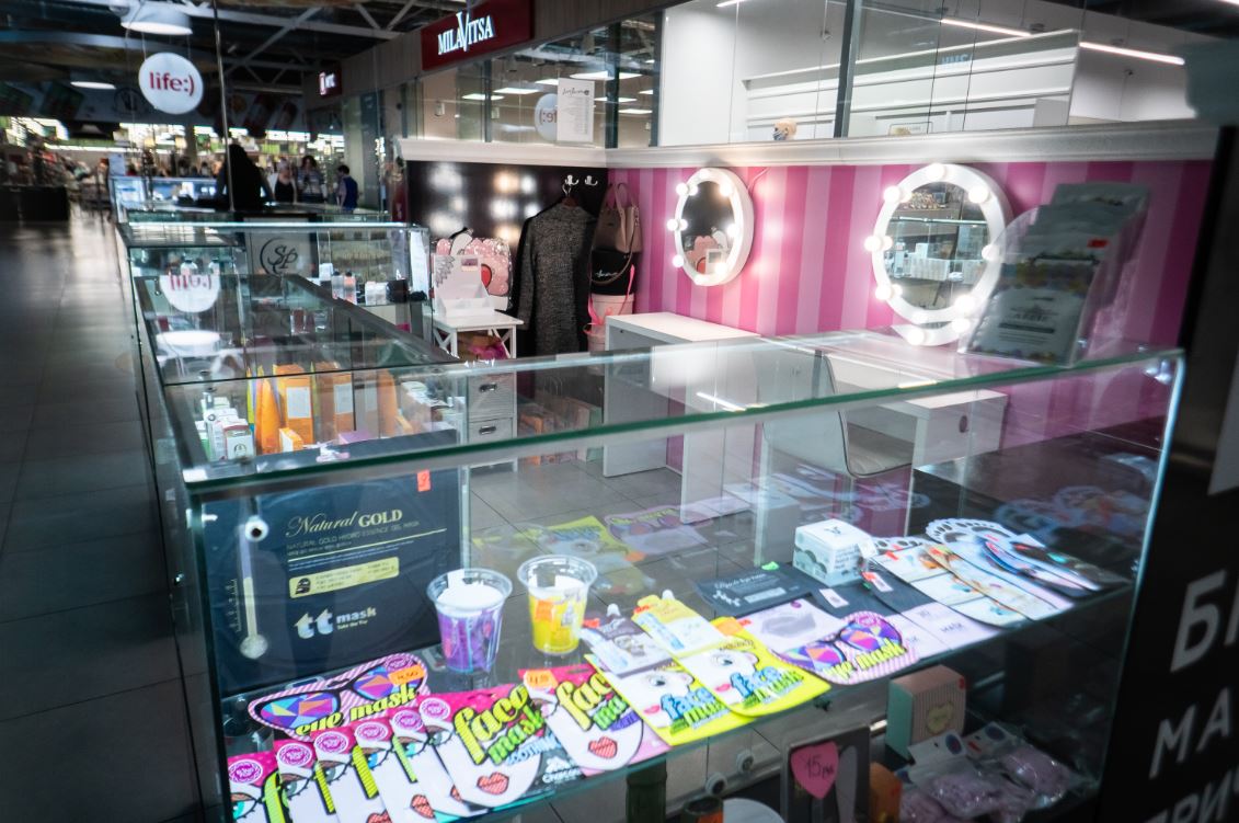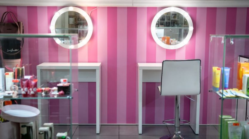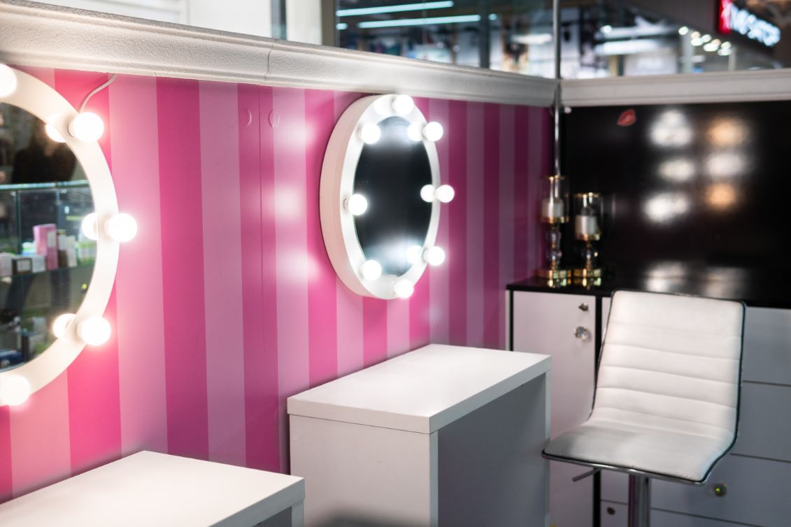 Оборудование: шкафы с витринами для продукции , стол визажиста, маникюрный стол.