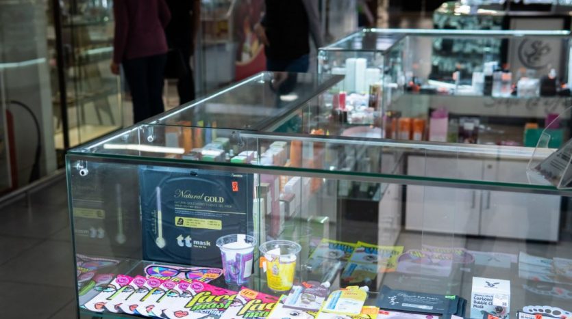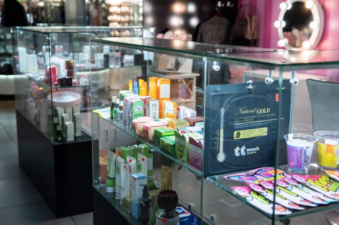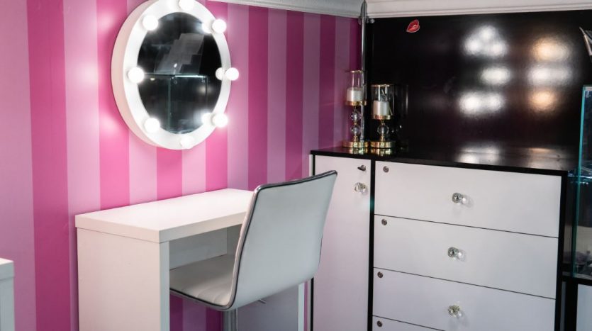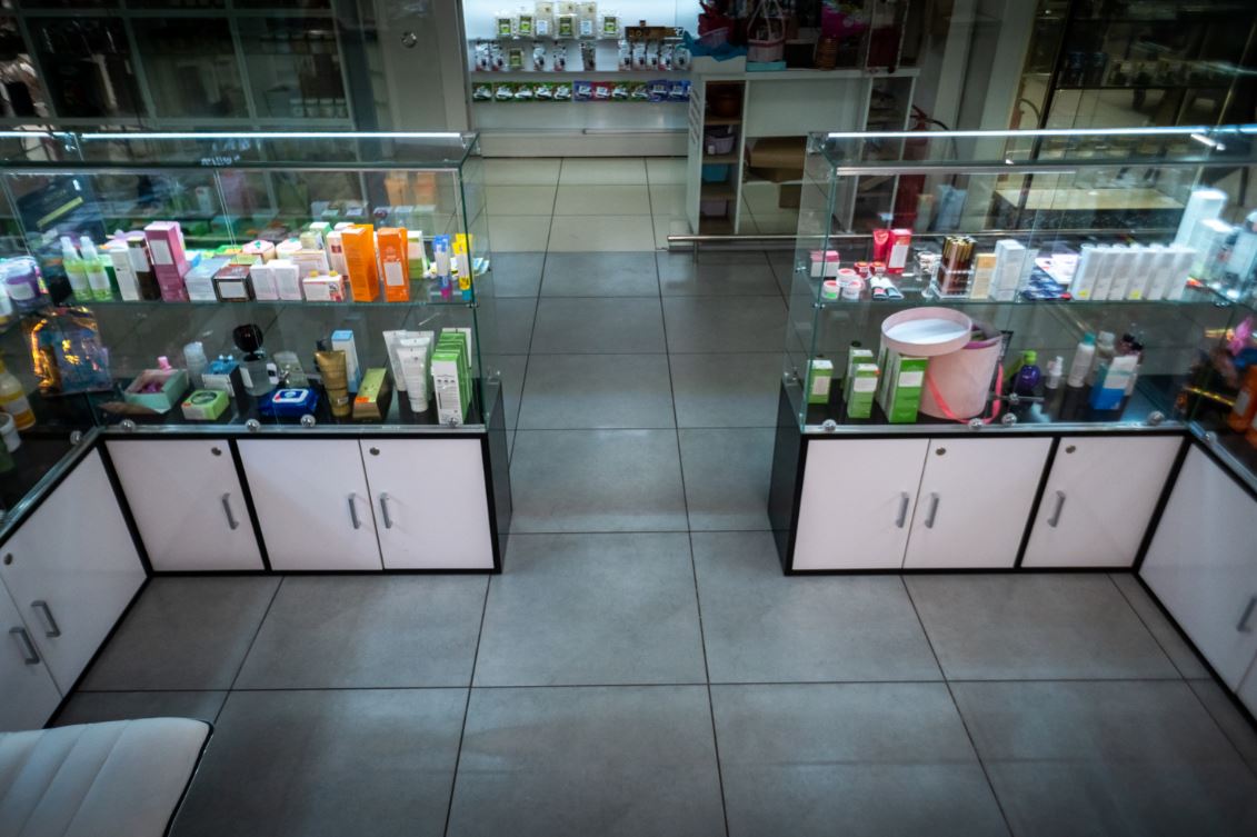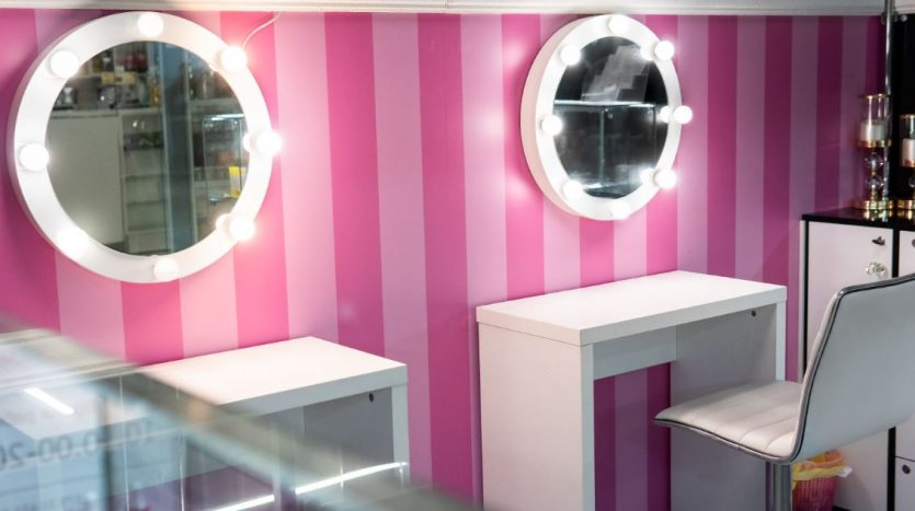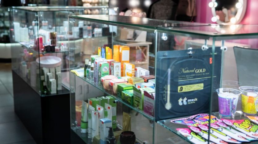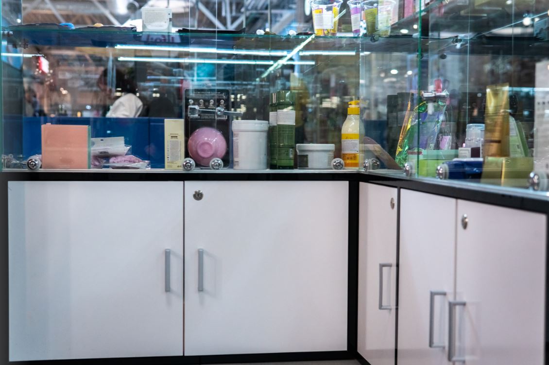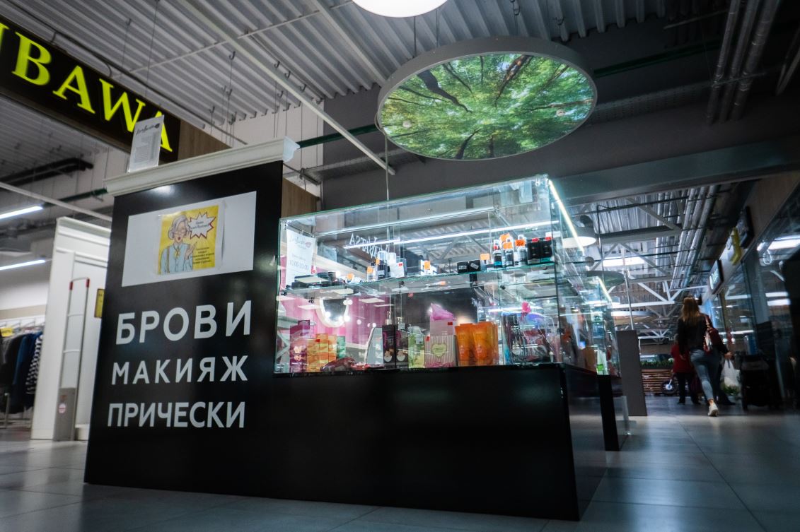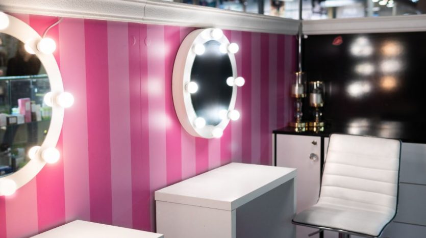 Оборудование: шкафы с витринами для продукции , стол визажиста, маникюрный стол.