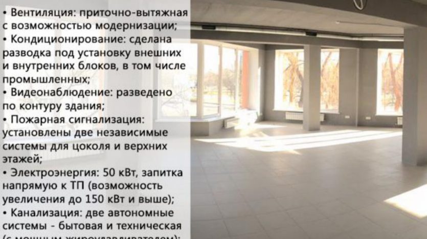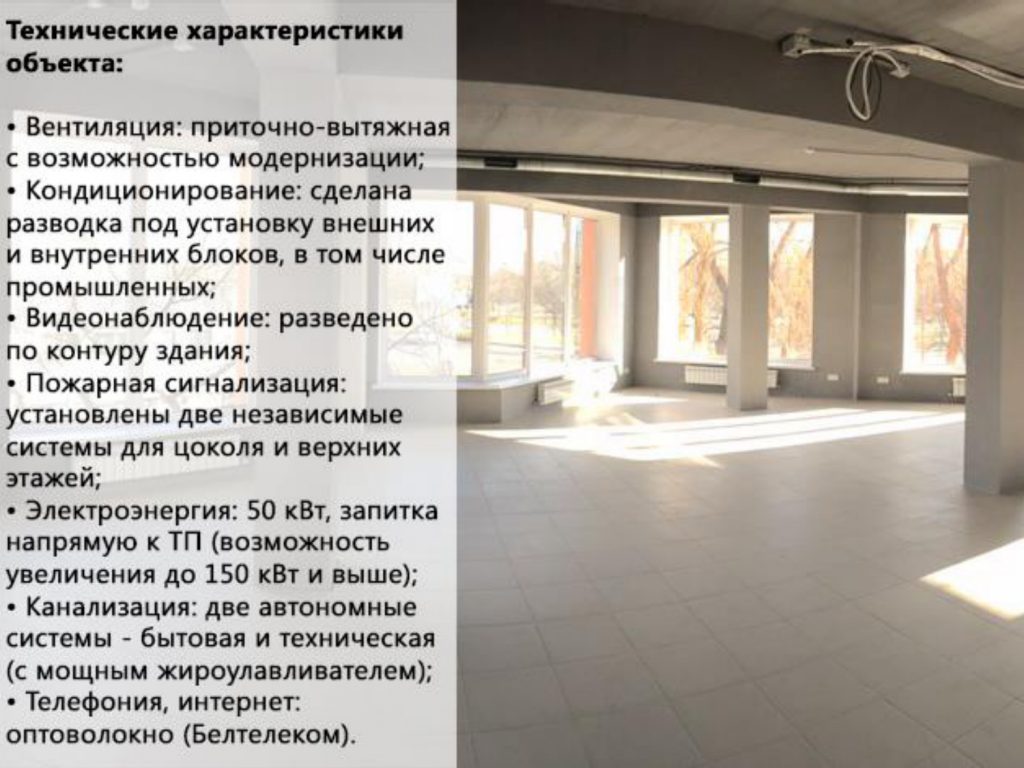 Технические характеристики объекта: вентиляция, кондиционирование; видеонаблюдение: разведено по контуру здания; пожарная сигнализация; электроэнергия: 120 кВт, запитка напрямую к ТП; канализация: две автономные системы — бытовая и техническая (с мощным жироулавливателем); телефония, интернет: оптоволокно (Белтелеком).