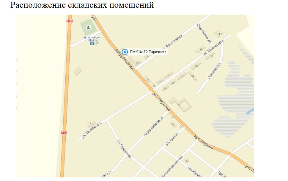- Складское помещение площадью 670,8 кв.м., расположенное по адресу: РБ, Гомельская область, светлогорский р-а,г.п.Паричи, ул.Шкловского, д.3 (Приложение 2);